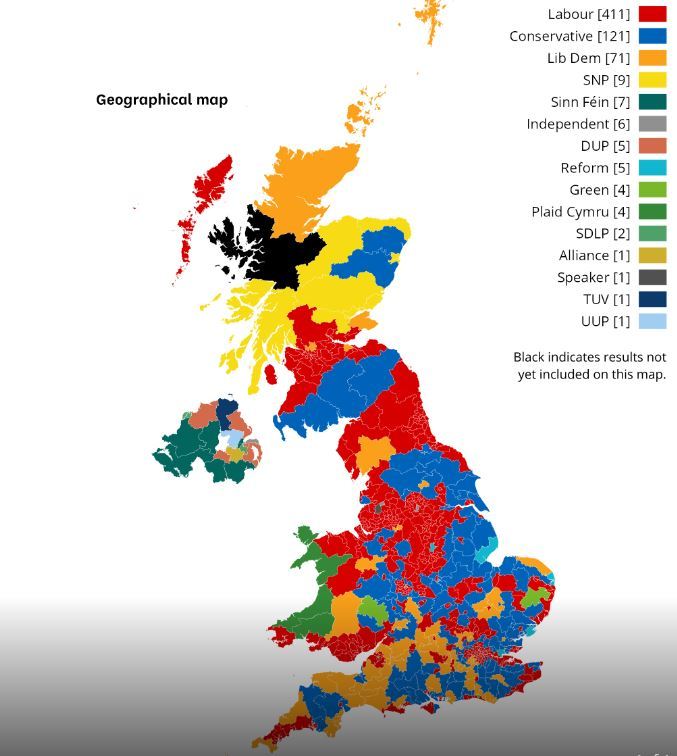 The final turnout figure that I have seen is 59.5%, effectively comparable to that of the 2001 election. I did speculate that it would likely be the lowest ever – it wasn’t, but it was virtually tied for the position. It illustrates a point that has been made by me and others throughout the year, which is that the single largest voting block – the non-voters – will not vote now except for something which is radically different enough to the existing options so as to be worth the effort of voting for. Parties like Reform UK certainly aren’t in that category.